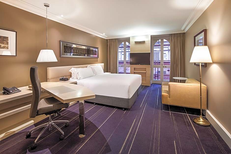 This suite offers views overlooking Collins Street, a spacious living area, spa bath, mini bar and executive lounge access.